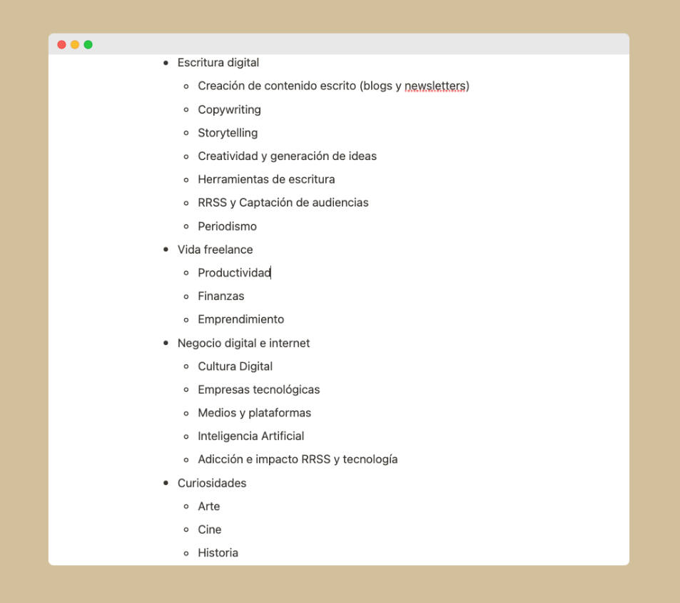 - Elige entre 3 o 5 temas que toques de forma recurrente porque formen parte de lo que dominas o de tus intereses.
