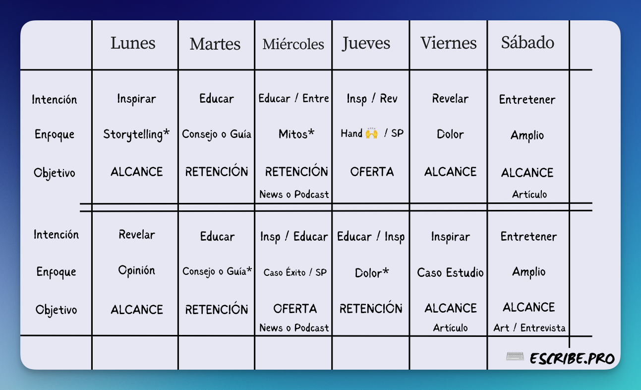 Tras estas dos ediciones, el objetivo es que salgas con un plan a 14 días para que sepas qué publicar que se parezca algo a esto